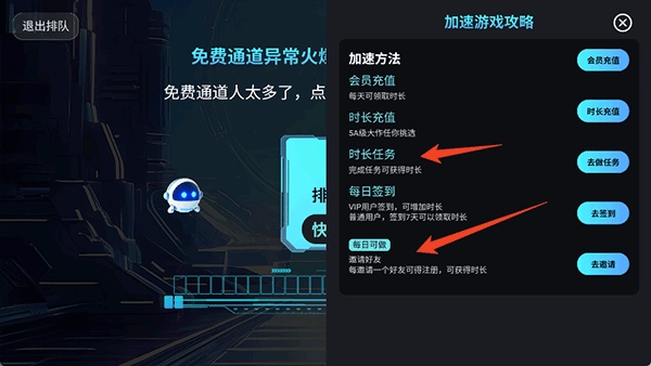 5、要是发现免费渠道使用人数过多,大家可以通过完成任务或者邀请好友的方式,来获取免费时长以及免排队的福利