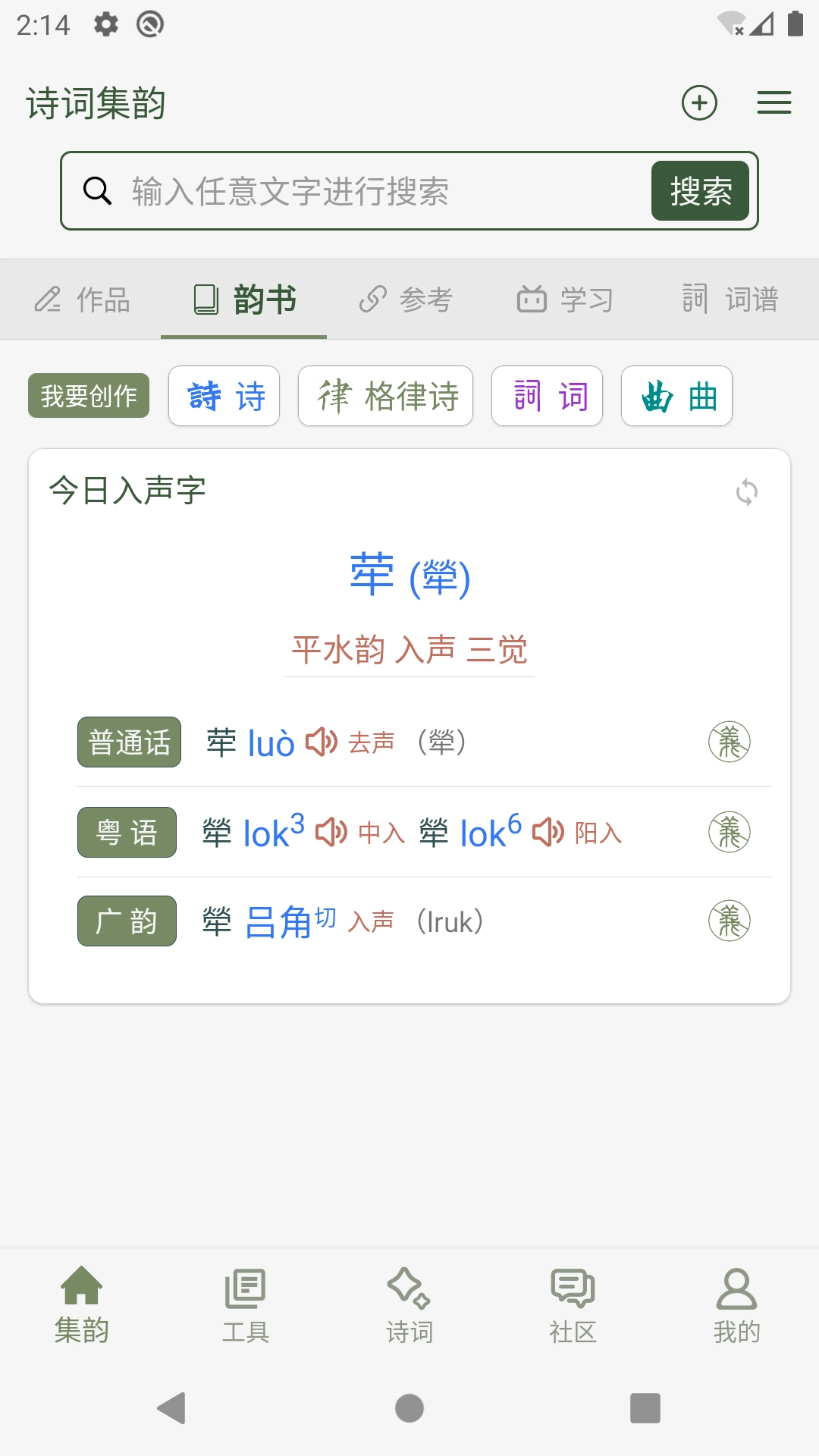 诗词集韵是一款专为学习打造的软件,收录了十万首诗词,用户可以自由解锁学习、鉴赏与理解功能,深入掌握诗词内容。软件具备强大的查询和搜索能力,还了康熙字典、古汉语字典等实用工具书,是诗词爱好者学习与创作的必备工具。此外,软件支持查看普通话、粤语、广韵等发音,能帮助用户轻松学习诗词的韵律和平仄,更好地检测诗词创作,感兴趣的用户不妨来体验一番。
