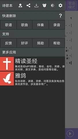 在播放诗歌时,屏幕上方显示滚动歌词,下方或切换后显示四声部简谱或五线谱。支持手动翻谱、自动滚谱,并可以调整字体大小与背景对比度,方便在光线较暗的教堂或户外使用。