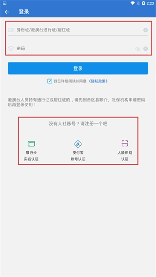 1、在登录页面输入【身份证】和【密码】,勾选相关协议后点击【登录】按钮;若没有人社账号,可通过卡、支付宝、人脸识别这三种方式中的任意一种进行认证注册。
