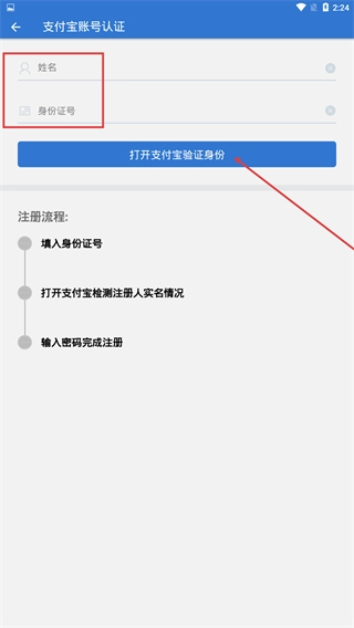 3、进入支付宝账号认证页面,填写【姓名】和【身份证号】,接着点击【打开支付宝验证身份】,验证通过后输入密码,即可完成注册。