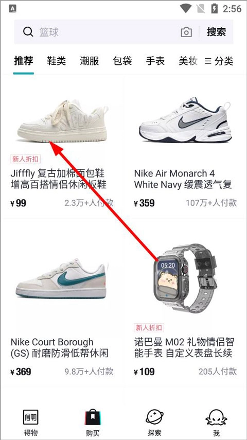 2、进入购买页面后,能看到鞋类、潮服、包袋、手表等类目,用户可以挑选自己想购买的物品,也能在页面上方的搜索框输入关键词进行搜索,然后点击对应的商品。