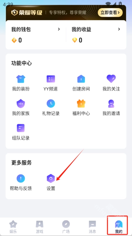 1. 打开yo语音,点击右下角的【我的】进入个人中心;在个人中心页面,选择【设置】选项;