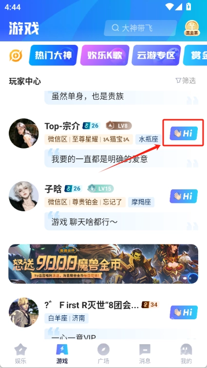 2. 进入主界面后,选择“游戏”选项。在玩家中心,点击HI