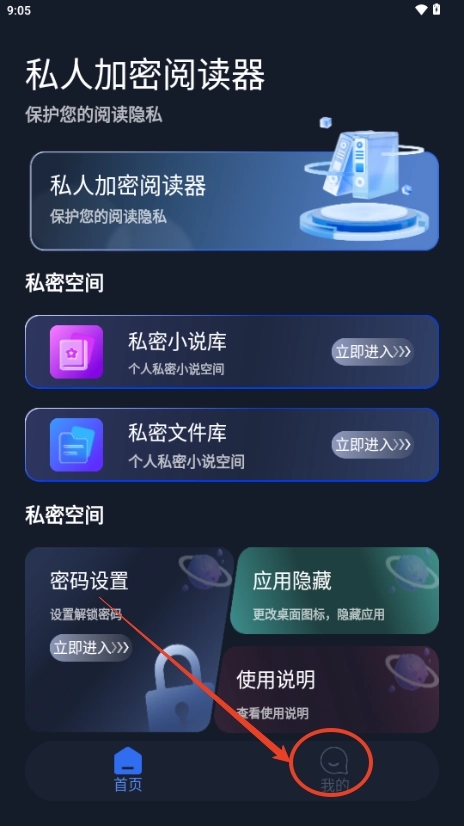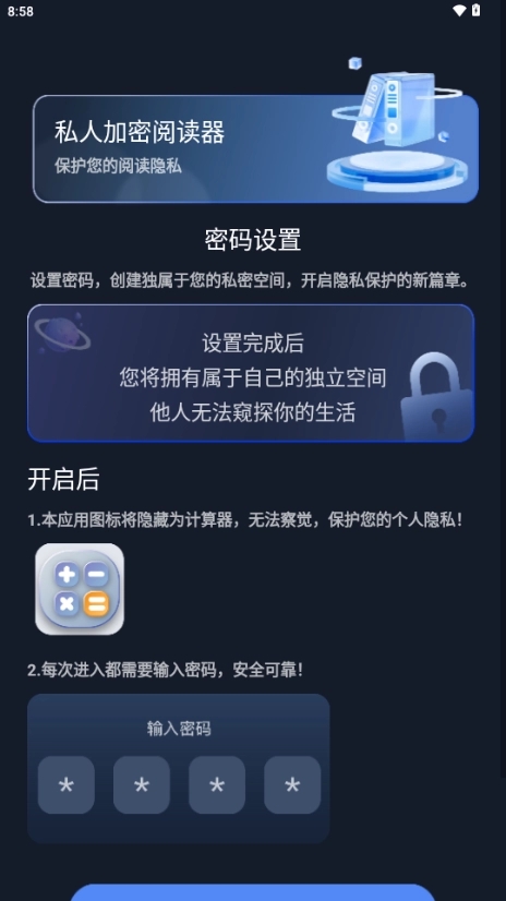 主要功能:加密电子书导入与解析、本地加密书库管理、阅读进度/书签/笔记的加密保存、支持多种格式、自定义阅读界面、密码/指纹解锁。