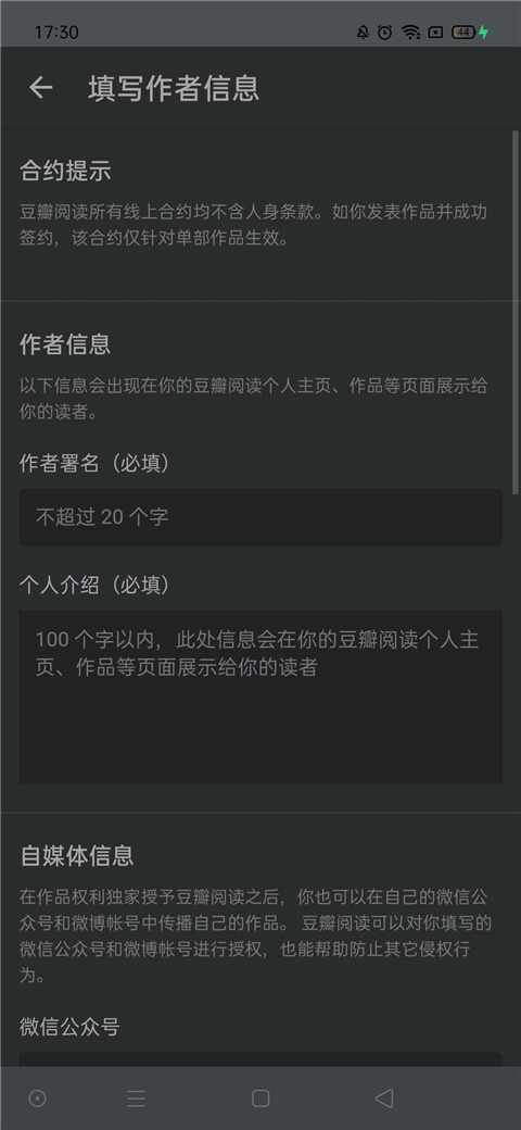 4、在申请填写的内容中,填写自己的笔名、个人介绍和联系方式,选择适合自己的类型来创建小说。刚入门的朋友也可以通过下文中的“常见问题”解决创作过程中遇到的问题。