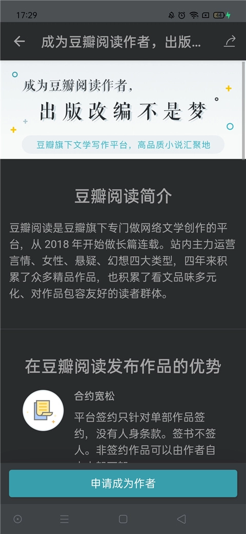- 作为原创作品的自出版平台,我们开放接收投稿(请通过电脑访问https://read.douban.com/submit/),作者可获得70%的分成;同时为作品提供可靠的版权运营服务;还会主办备受瞩目的征文大赛,助力新人作者增加曝光机会。